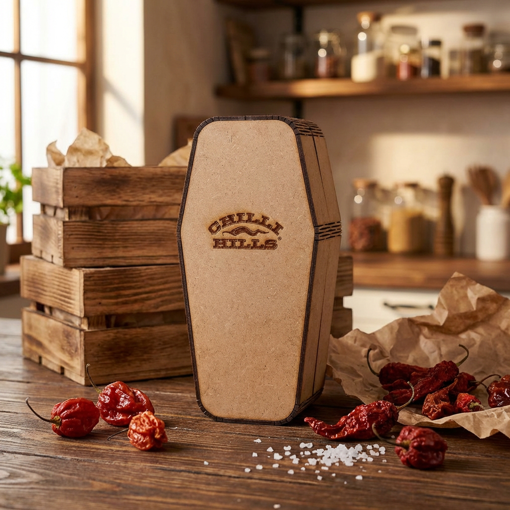DeathBox este o cutie premium din lemn, tip sicriu, creată special pentru a transforma orice sos Chilli Hills de 100 ml într-un cadou memorabil. Un accesoriu cu impact vizual puternic, inspirat din estetica dark a brandului, perfect pentru cei care vor să ofere mai mult decât un simplu produs.