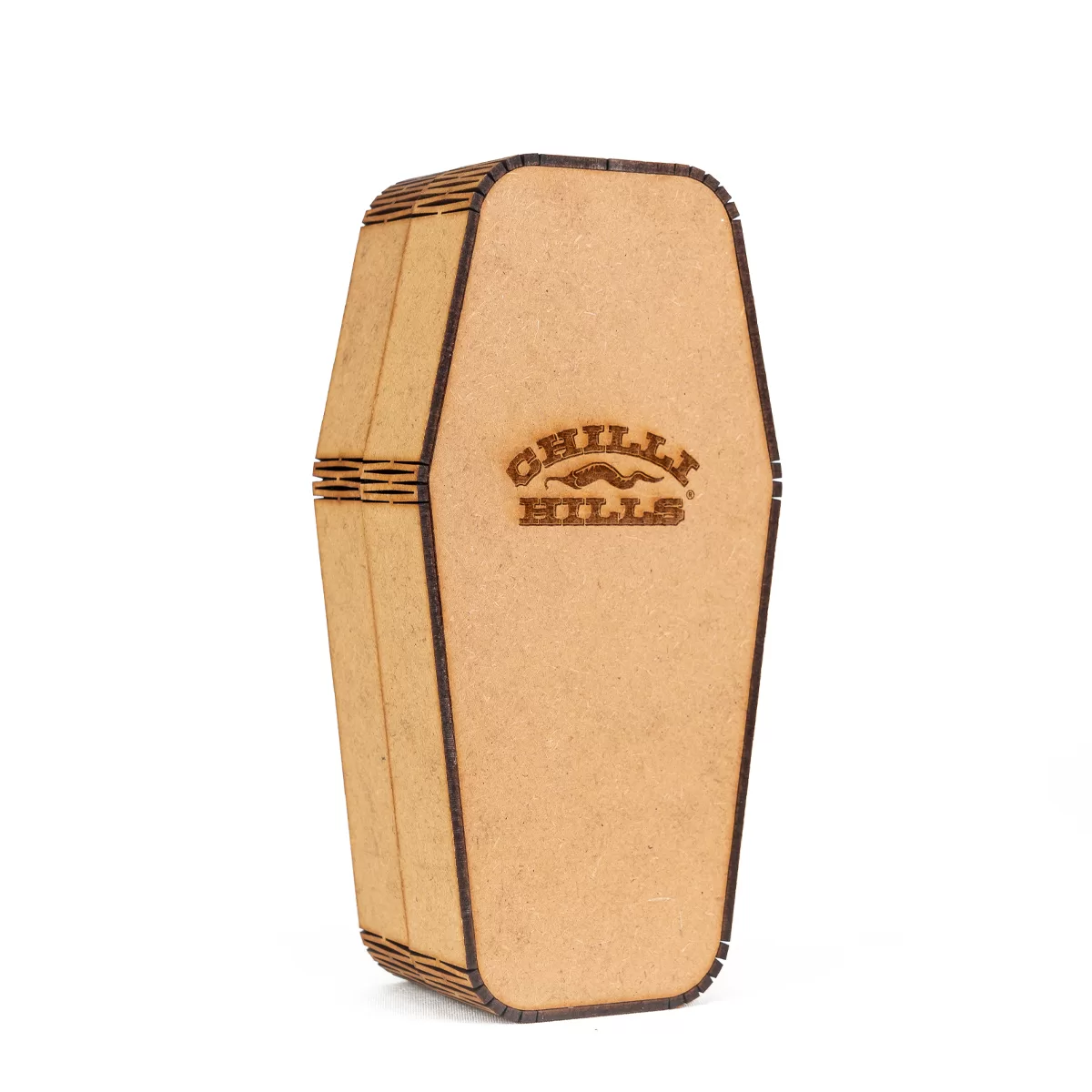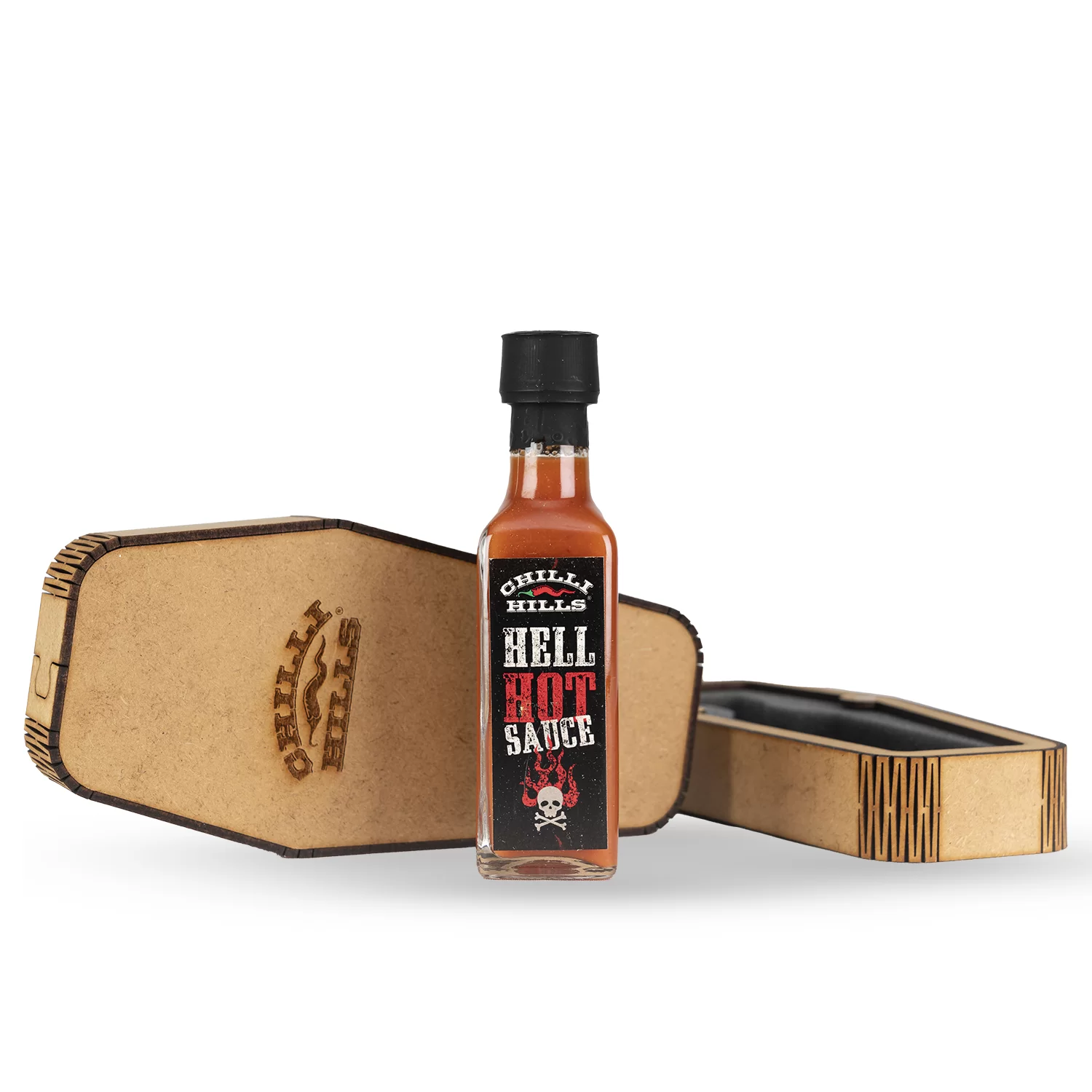 O experiență extremă într-un ambalaj de colecție. HELL HOT BOX vine într-un sicriu de lemn luxos, gravat cu logo-ul Chilli Hills, și conține sosul nostru legendar Hell Hot de 100 ml.